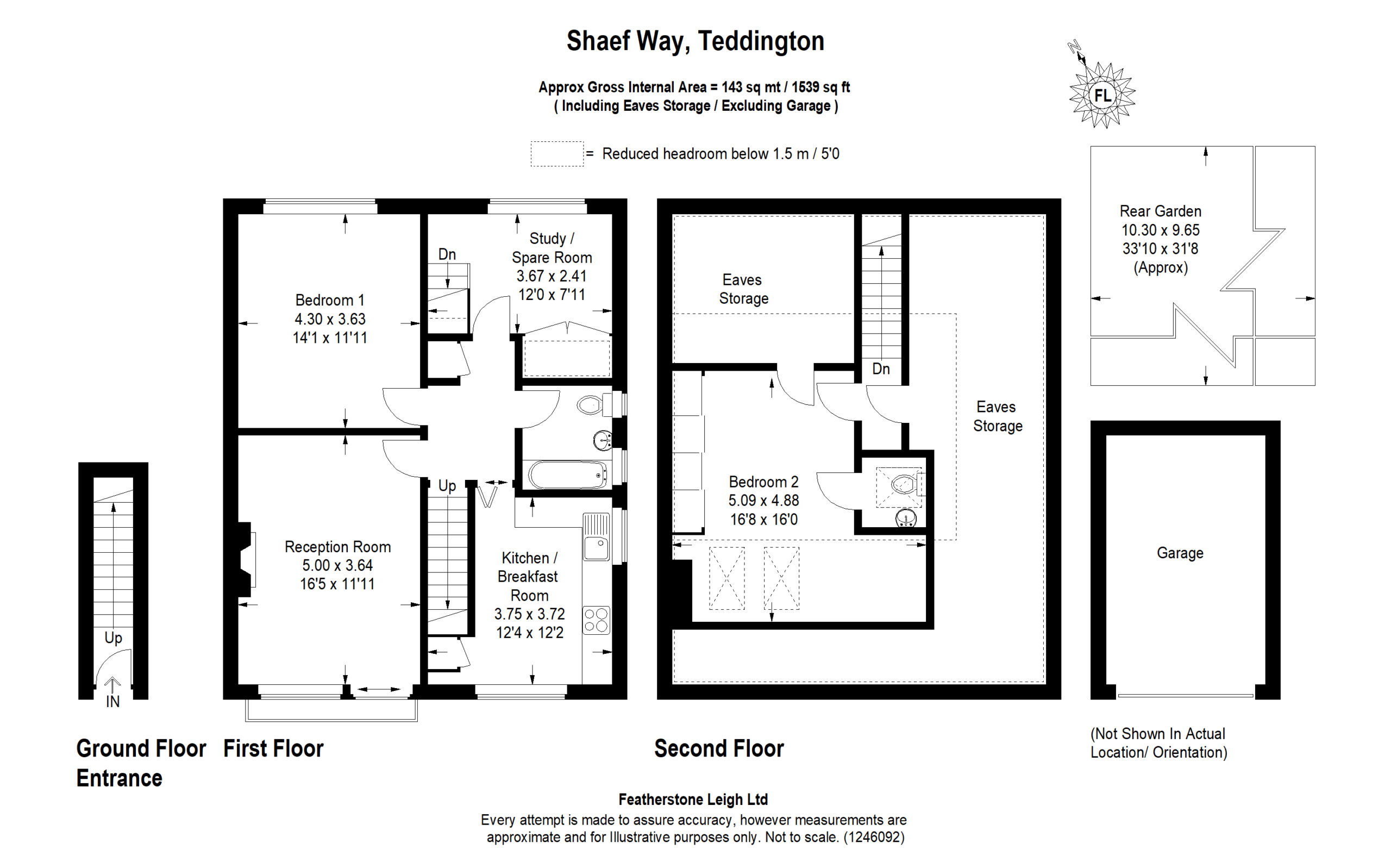 This beautifully presented maisonette, with private rear garden, is located in a popular cul-de-sac development just opposite the incredible open wilderness of Bushy Park. Shaef Way a fabulous location for commuters to the city as it is actually less than half a mile from Teddington train station. As well as the private 34 by 32ft lawn garden with this flat it includes a garage within the development. There is parking available to the front of the property too. Internally it has been extended in to the loft to provide three bedrooms and there is a stylish family bathroom in addition to the WC off the loft room which also includes newly fitted wardrobes along one wall. The living space includes a roomy 12 by 16.5ft living room with south-west facing Juliet balcony. The well-appointed, modern kitchen is very spacious with attractive white, Shaker-style units and has large dual aspect windows allowing plenty of southerly light in. This property has an impressive total floor area of 1075 sq ft and is impeccably presented with double-glazing throughout. There is outstanding loft storage with two large voids and the stunning original block-parquet flooring has been restored to a superb standard to really finish the whole property off. No onward chain. Lease remaining – 933 years remaining Ground rent – £17 pa No service charge – own responsibilty for building insurance and roof maintenance only Council Tax Band – D (£2372pa) EPC rated C