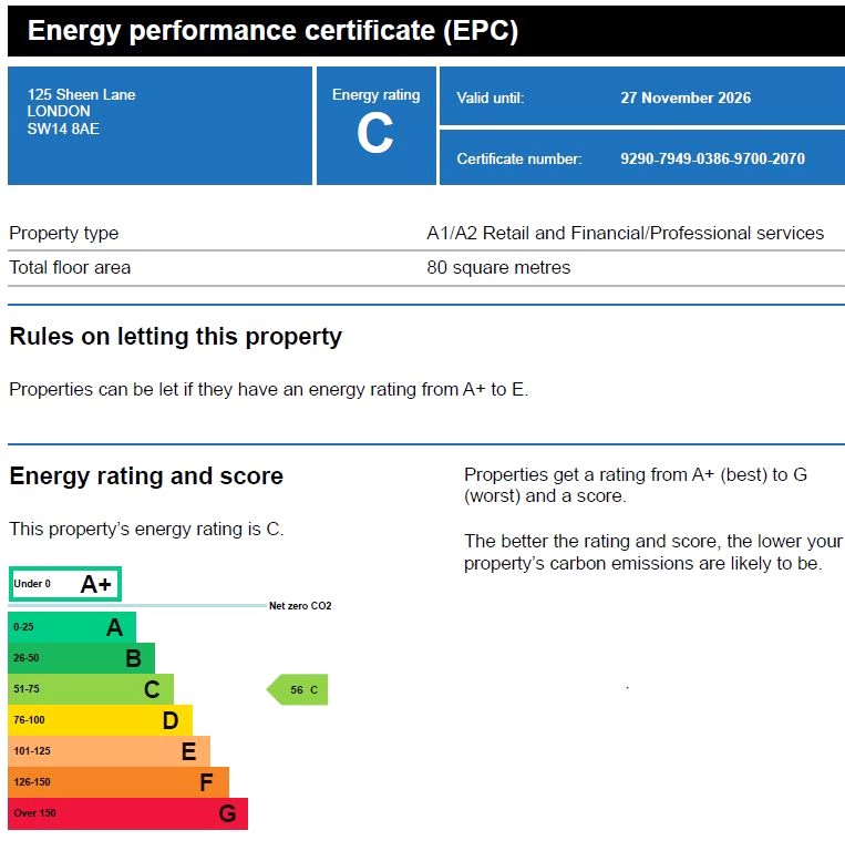 The shop has been extended to provide a total Net area of approximately 83.1 sq m/ 894 sq ft – it can also be accessed via an attractive mews to the rear. The current owners added the playroom to the back of the shop whilst benefiting from a large window frontage onto Sheen Lane. Benefits for being E class, with its multiple use options.