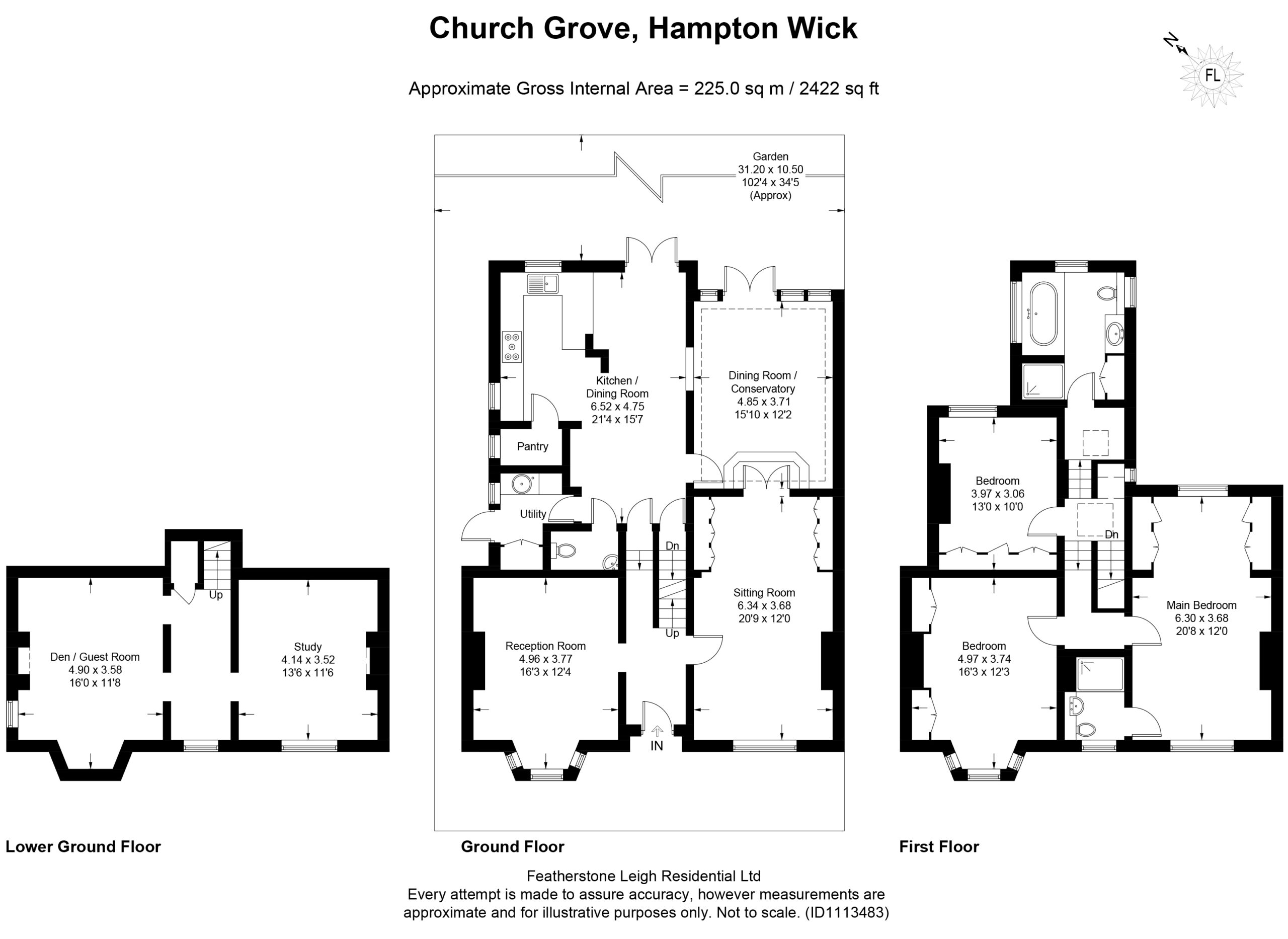 This delightful early Victorian house, originally built around 1840-50, is detached with a grand double-fronted layout and refurbished Georgian style panelled, double-glazed box sash windows, it has also been modernised and extended over time to offer an abundance of living space over the ground and also in to an expansive basement which features two large rooms. The main reception rooms on either side of the receiving hallway offer a study/drawing room with ornate working fireplace and the main double reception with gas fireplace and stain glass double doors to a conservatory extension. To the rear, there is a modern kitchen with granite worktops and a separate pantry. There is utility room with side passage access and a separate WC. The kitchen is open-plan to a dining space with double doors on to a beautifully landscaped 100ft lawn garden. The garden has been thoughtfully designed and maintained with a large patio area, perfect for entertaining. This leads down to a manicured lawn with mature border shrubs and flowers and further containing two garden sheds and a greenhouse. The accommodation on the first floor offers three double bedrooms with the main bedroom featuring an en-suite shower room. This is in addition to a more spacious four-piece family bathroom with plenty of natural light and luxurious marble tiling. The basement area is currently arranged as a fourth bedroom and the second room as a study. This area is flexible in terms of how it is utilised. The location of this characterful and spacious property is wonderful as it overlooks Royal Bushy Park with over 1000 acres of historic parkland. The Kings Field, just opposite, is also a lot of fun with a café, play area, a well-managed skate park plus public tennis courts. There are numerous schooling options with Teddington Secondary close by, as well as Hampton Wick & St John The Baptist junior schools. There are several other outstanding schooling options just over the river in Kingston-Upon-Thames plus the array of retail, leisure and culinary pleasures within a third of a mile (Google ref: 8 minutes walk). EPC rated D