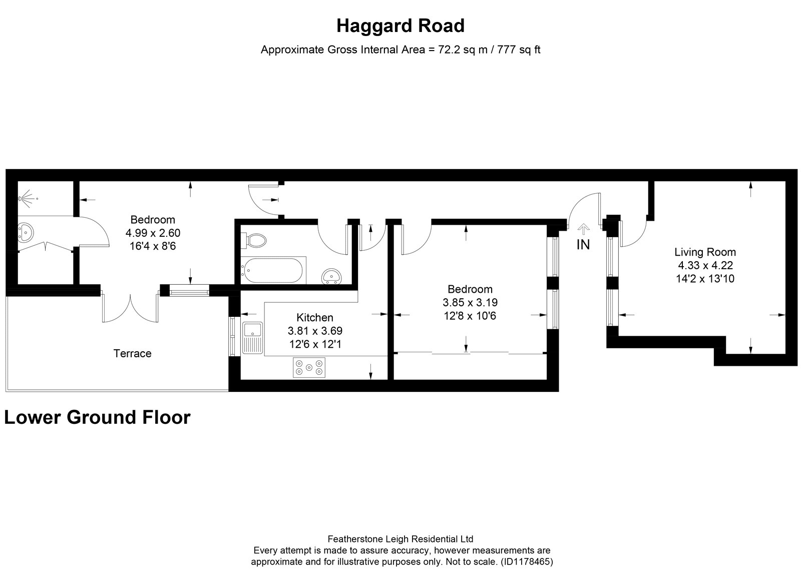 The property offers a spacious reception room, two double bedrooms, and a family bathroom. The primary bedroom includes built-in storage, while the second benefits from an en-suite shower and direct access to a private patio. The layout is flexible and can be adapted to suit a variety of lifestyle needs.