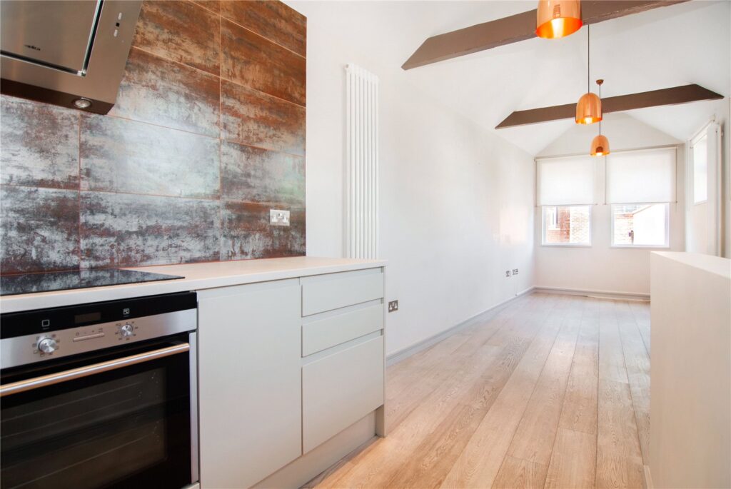 A stunning split level apartment, which is part of a unique development created from the Old Victorian Print-works. Accommodation briefly comprises; to the ground floor there is a good sized bedroom with built-in wardrobes and an en-suite bathroom. To the first floor there is an open plan reception room with modern kitchen and wood flooring. King Street is perfectly positioned neighbouring the historic Riverside, the beautiful Richmond Green and Richmond town centre – with its wide selection of shops, bars and eateries. For those looking to commute Richmond is blessed with both Tube and train stations offering excellent access into central London.
